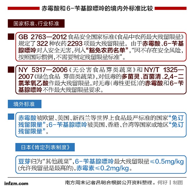 吴月芳告诉南方周末记者,业内公认最严格的日本《肯定列表制度》针对包括豆芽的“其它蔬菜”制定标准,6-苄基腺嘌呤最大残留限量≤0.5mg/kg,赤霉素残留量≤0.2mg/kg。